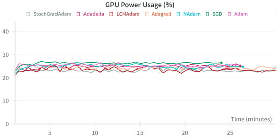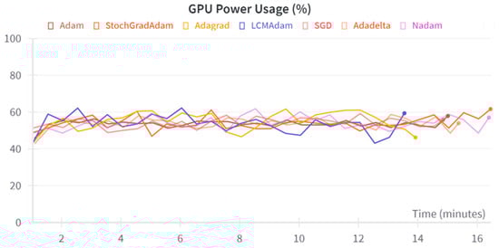 Based on Figure 8, on the CIFAR10 dataset, the LCMAdam algorithm has slightly lower GPU power consumption compared to the StochGradAdam algorithm, but still outperforms the Adam algorithm and other compared algorithms. This is due to the LCMAdam algorithm’s dynamic learning rate adjustment strategy, which results in a slightly longer training time compared to some other algorithms. The LCMAdam algorithm’s dynamic learning rate adjustment strategy offers more precise guidance for model optimization, thereby enhancing the model’s convergence speed and performance to some extent.