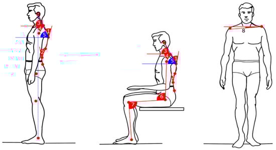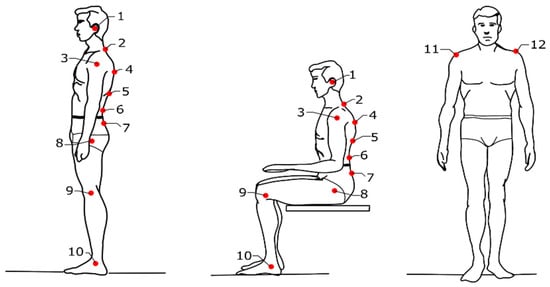 The pictures of each of the 100 participants, standing and sitting in various positions, were post-processed and tagged by two medical doctors who specialize in physiotherapy and have practiced this profession for more than 10 years. They manually placed body markers on the pictures at precisely specified locations on the human body, such as the head, neck, shoulder, thorax, and lower back (cf. Figure 3).