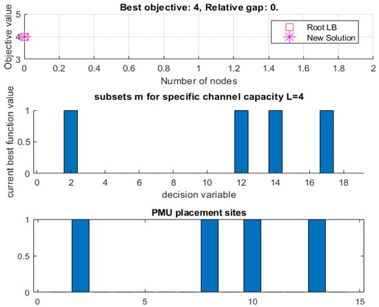 Heuristic algorithms work together with BBA to find a solution of the same quantity and quality in a minimal running time [25,26]. Furthermore, transforming the binary-integer programming into a nonlinear polynomial model shows the robustness required to find a proper number of PMUs and their placement sites for a fixed number of channels [13,14,15,16,17,18,19,20,21,22,23,24]. The numerical optimization challenge is to run mathematical as well as heuristic algorithms, including BBA, SQP, IPMs, GPSA, GA, and BPSO, to discover the best combination between the proper PMU number and the upper bound of channel capacity without increasing the cost of installation [56,57,58,59,60].