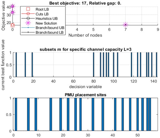 This work proposes an OPP-based model considering the limited number of channels per PMU device using extended ILP models initially presented in [56,57,58] and [60] where a set cover problem is introduced [28,29,30,31]. The suggested optimization models have been solved by BBA, heuristic algorithms, and nonlinear algorithms.