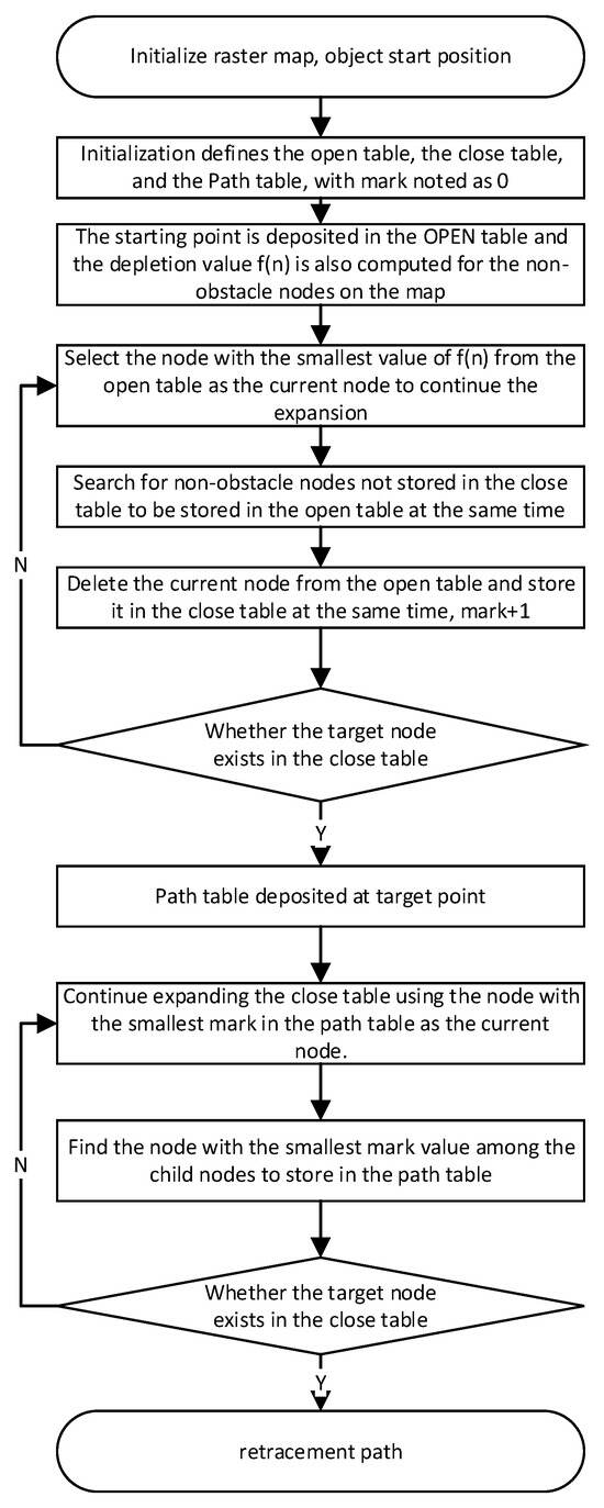 The process of the A* algorithm described in this paper is shown in Figure 1. The open table, close table, and path table are defined to store the expansion nodes, and the mask is initialized to 0. The optimal node is selected from the open table and stored in the close table, and its successor nodes are put into the open list. The optimal node is selected by repeated operation, and the optimal node is stopped when the target is reached or the open list is empty.