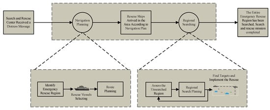 An intelligent ship action planning method for maritime emergency rescue is the impetus that allows for maritime rescue forces to carry out actions. According to the task requirements, an intelligent action planning model algorithm is constructed to plan the sailing route and action steps of maritime rescue vessels, continuously track the ongoing action tasks, and feed back the task execution in real time. As shown in Figure 2, intelligent ship action planning for maritime emergency rescue is mainly divided into two stages: the navigation planning and regional search stages. In the navigation planning stage, according to the pre-planning of the navigation route in the maritime rescue area, it is ensured that the ship can quickly and safely reach the incident area from the starting point. After the ship reaches the incident area, it enters the regional search phase. In the regional search stage, the ship delimits the search area and carries out search route planning according to the reported location of the incident, searches for the target that needs to be rescued along the way, and continues the regional search after the rescue is completed.