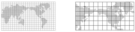The data used for the creation of this paper were sourced from the raster data of sea and land maps provided by Natural Earth [23] This dataset uses the WGS-84 (World Geodetic System 1984) coordinate system, with a total of about 900 million pixels, each pixel representing a spatial area of 500 m × 500 m on the Earth’s surface. The rasterized map data are intercepted according to the coordinate values of the starting point and the target point in the exploration mission and inputted into the algorithm to correct the coordinates. A large number of rosters are simplified, and the electronic chart is appropriately trimmed according to the regional scope required by the mission planning, as shown in Figure 3.