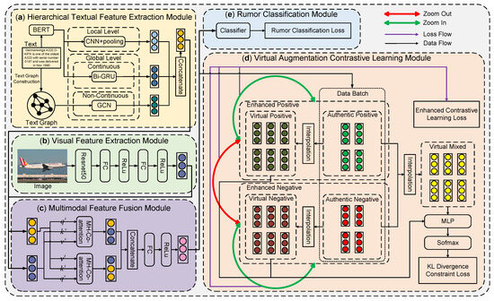 Based on the above considerations and to explore a more effective method for multimodal rumor detection, we propose MVACLNet, a Multimodal Virtual Augmentation Contrastive Learning Network. In MVACLNet, we first design a Hierarchical Textual Feature Extraction (HTFE) module to extract textual features from multiple perspectives, namely local, global continuous, and global non-continuous, to achieve a more comprehensive utilization of text data. Then, we enhance the fusion of textual and visual features using a modified cross-attention mechanism, which operates from textual–visual and visual–textual perspectives at the feature value level, to obtain richer and more precise authentic multimodal feature representations. Following this, we devise a Virtual Augmentation Contrastive Learning (VACL) module as an auxiliary training module. This module serves three purposes. One is to generate extra virtual multimodal feature representations and corresponding virtual labels using an interpolation-based data augmentation strategy, regarded as augmented samples, to enhance the diversity of multimodal samples in feature space, thus strengthening the feature learning of the model. The second is to introduce contrastive learning and additionally leverage ground-truth labels and virtual multimodal feature representations to enhance it, thereby helping the model capture more crucial similarities and differences among multimodal samples. The third is to perform the Kullback–Leibler (KL) divergence constraint between predicted probability distributions of the virtual multimodal feature representations and their corresponding virtual labels to help the model capture more content-invariant multimodal features. In particular, the introduced ground-truth labels can provide effective supervisory signals for contrastive learning to prevent the model from misclassifying posts with noise. Finally, a Rumor Classification module is developed to perform rumor prediction on the authentic multimodal feature representations. Overall, with the help of VACL, MVACLNet can learn more robust and generalized multimodal feature representations, thereby improving its detection performance.