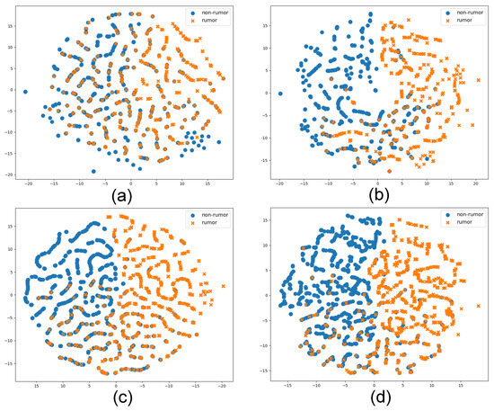 The visualization results of the multimodal feature representations learned by “w/o VACL” and MVACLNet on the Twitter and Weibo datasets. (a) The visualization result of the multimodal feature representations learned by “w/o VACL” on the Twitter dataset. (b) The visualization result of the multimodal feature representations learned by MVACLNet on the Twitter dataset. (c) The visualization result of the multimodal feature representations learned by “w/o VACL” on the Weibo dataset. (d) The visualization result of the multimodal feature representations learned by MVACLNet on the Weibo dataset.