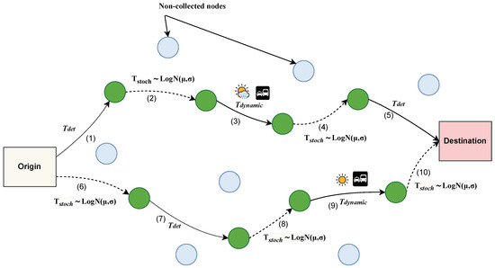 where represents the deterministic time of the edge connecting nodes i and j, is a coefficient for edge standard time, represents the coefficient for the weather, and represents the coefficient of the congestion. In addition, the term represents the independent error term, assumed to be 0 to maintain the deterministic travel time value when the conditions are ideal (w and c parameters are 0). For our analysis, we have employed the values , , and , which was designed so the dynamic travel time varies between the deterministic travel time and times the deterministic travel time. In addition, the edges are categorized into two parts for the dynamic scenario following these conditions. If the node index is even, we classify the corresponding edge as dynamic. Otherwise, we classify the edge as deterministic.