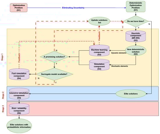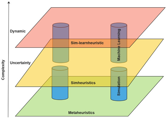 In the field of optimization, simheuristics and learnheuristics are increasingly being used to solve complex combinatorial optimization problems under uncertainty. Simheuristic methods combine the advantages of both simulation and heuristics to tackle such problems. On the other hand, learnheuristics employ machine learning algorithms to improve the quality of solutions over time. Gonzalez-Neira et al. [13] proposed a hybrid simheuristic method to solve a complex multicriteria stochastic permutation flow shop problem. This method combines a greedy randomized adaptive search procedure, Monte Carlo simulations, a Pareto archived evolution strategy, and an analytic hierarchy process to handle stochastic processing times and sequence-dependent setup times. It considers quantitative criteria like earliness/tardiness and qualitative criteria like product and customer importance. The experimental results showed the significant impact of processing time distributions and coefficients of variation on decision criteria. Similarly, Caldeira and Gnanavelbabu [14] proposed a simheuristic approach to solve the stochastic flexible job shop scheduling problem. They integrated Monte Carlo simulations into a Jaya algorithm framework to minimize the expected makespan, considering uncertainties in production processes represented by random variables with known probability distributions. The computational results demonstrated its effectiveness across different variability levels using reliability-based methods, showcasing its capability in handling stochasticity in flexible job shop scheduling. Yazdani et al. [15] proposed a novel simheuristic approach to address the waste collection routing problem in the context of construction and demolition waste management. The proposed approach utilized a hybrid genetic algorithm to optimize vehicle route planning from construction projects to recycling facilities. In their research. they conducted a comparative analysis with existing approaches and demonstrated the high performance of the proposed simheuristic algorithm. Real case studies from Sydney, Australia, were used for evaluation, contributing significantly to optimizing future waste collection problems and providing recommendations for decision-makers and practitioners. Crawford et al. [16] proposed a Q-learnheuristic framework integrating Q-Learning into metaheuristics to address the exploration–exploitation balance dilemma. This framework, applied to various metaheuristics including the Whale Optimization Algorithm and the Sine-Cosine Algorithm, enhanced the selection of operators like binarization schemes for binary combinatorial problems. This study extended the framework’s applicability, demonstrating statistical improvements in both the exploration–exploitation balance and the solution quality when solving the set covering problem. Gomez et al. [17] introduced a novel approach to tackle the capacitated dispersion problem, which involves selecting elements within a network while considering their bounded service capacities. The introduction of a random Bernoulli component influences node capacities, potentially resulting in nodes with zero capacity based on environmental variables. The proposed learnheuristic approach hybridizes a heuristic algorithm with reinforcement learning, offering a promising method to handle this intricate problem variant effectively. Bullah and van Zyl [18] proposed a novel learnheuristic approach to solve a constrained multi-objective portfolio optimization problem. The authors developed a hybrid approach that combines machine learning and a metaheuristic algorithm to obtain high-quality solutions that satisfy multiple objectives, such as maximizing returns while minimizing risk and adhering to constraints such as transaction costs and diversification requirements. The learnheuristic approach involves training a neural network to predict the quality of solutions obtained by a metaheuristic algorithm and using this prediction to guide the search toward promising regions of the solution space.