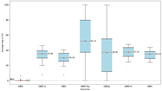 Figure 4 shows an overview of Table 2 which details the performance of our sim-learnheuristic approach for all considered scenarios. The horizontal and vertical axes represent the four uncertainty scenarios and the percentage gap obtained with respect to the BKS reported in the literature, respectively. Median values are represented by triangles and lines, while outliers are presented by circles. The average percentage gap for the OBD-S is , while the average percentage gap for the OBS is . This means that, on average, the OBS solutions are closer to the BKS solutions in the stochastic scenario. In the hybrid scenario, if we compare the percentage gaps of the OBD-H with the OBH, we can see that the OBH outperforms the OBD-H and is closer to the BKS. However, the average gap for OBD-Dy is . This very high gap indicates that the deterministic approach does not adapt well to the changing dynamics of the system and results in considerably worse outcomes.