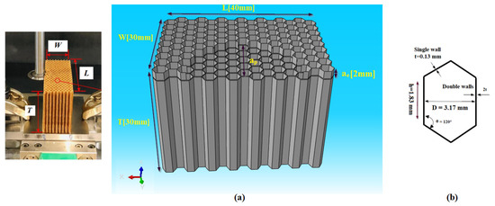 (a) Dimensions of the Nomex honeycomb structure (NHC); (b) Dimensions of the alveolar cell [21].