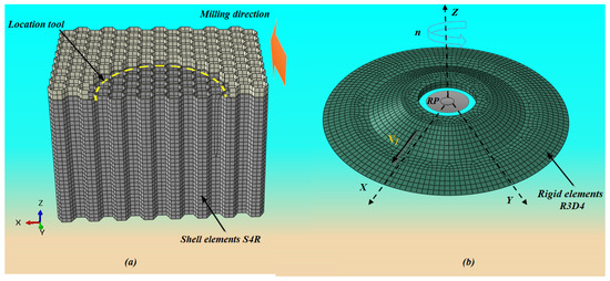 This paper provides a simulation study of the rotary ultrasonic machining (RUM)-assisted cutting process of the NHC core. This simulation is based on a numerical FE model developed with the Abaqus/Explicit software. The cell walls of the Nomex honeycomb structure are composed of two-thirds single-cell walls and one-third double-cell walls. The corresponding thicknesses of single- and double-cell walls are set to 0.13 mm and 0.26 mm, respectively, in the numerical model. In this approach, the meshing of the NHC core walls is achieved using reduced-integration four-node S4R shell elements, as shown in Figure 5a. Throughout the numerical modeling, the UCK tool is supposed to be rigid, which means that it is non-deformable during the milling process. Therefore, the UCK milling cutter is meshed using rigid quadrangular elements with four nodes (R3D4), as presented in Figure 5b.