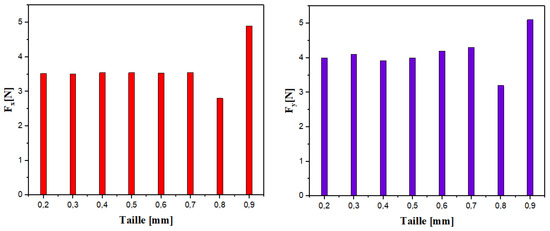 The choice of mesh size is closely linked to the nature of the underlying mechanic phenomenon and the objectives of the simulation. This mainly results from its direct effectiveness both on the precision of the results and on the time necessary to carry out the calculation. Although the use of a coarse mesh makes it possible to reduce the calculation time, it results in lower precision of the results. On the contrary, using a finer mesh results in an increase in calculation time, but allows for better-quality results. Thus, during each simulation, it is essential to seek the right accommodation between the size of the mesh, the calculation time, and the precision of the obtained results. In this section, our attention was focused on the impact of mesh size on the components of the cutting force when modeling the milling process. To this end, eight simulations were carried out by adjusting the mesh dimensions, varying from 0.2 mm to 0.9 mm. The simulations were carried out with the same cutting conditions, including a feed rate of 3000 mm/min, a spindle speed of 5000 rpm, and an amplitude vibration is 25 µm. The obtained results are shown in Figure 7.