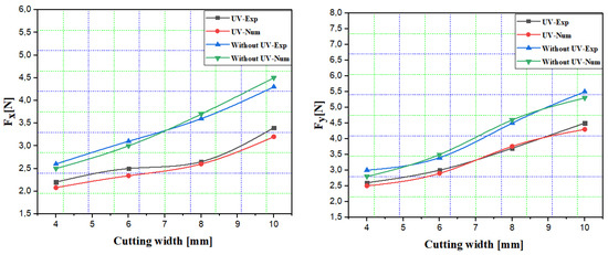 A numerical simulation was carried out to verify the validity of the numerical model, evaluating the impact of different cutting widths on the Fx and Fy components when milling the NHC core. This analysis was performed using RUM technology regardless of whether or not ultrasonic vibrations were applied. To carry out this study, four cutting width values were examined, including 4 mm, 6 mm, 8 mm, and 10 mm. Other cutting parameters remained constant throughout the analysis, including a feed rate of 2000 mm/min, a spindle speed of 3000 rpm, and an amplitude vibration is 25 µm. The obtained results are illustrated in Figure 8 [20].