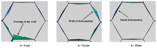 The machined surface of the Nomex honeycomb core is essential to building the sandwich structures. Its precise optimization is essential to ensure the robustness and durability of these materials in various industrial applications. Typically, imperfections in the machining of NHC structures come in various forms, including burrs, tears of the walls, and uncut fibers. These defects can appear at different stages of the machining process and have the potential to impact the final quality of the structure. Therefore, in-depth analysis is required to adjust manufacturing parameters and minimize these imperfections. To study the effect of vibration amplitude on the machined surface, numerical simulations were conducted by adjusting the vibration amplitudes to values of 0 µm, 10 µm, and 25 µm. The cutting simulation is carried out under the same cutting conditions, notably a feed rate at 3000 mm/min and a spindle speed at 1000 rpm, which were kept constant throughout the milling simulation. The machining defects generated by the numerical model were spotted by visual inspection with the naked eye and are illustrated in Figure 9.