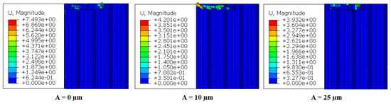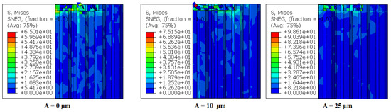 Studying the stress distribution on the walls of the honeycomb structure of the NHC provides crucial insights into the cutting conditions in the vicinity of the machining zone. This analysis enables a deeper understanding of how ultrasonic vibrations affect the cutting process. By examining the stress patterns, researchers can gain valuable information about how vibrations impact material behavior and chip formation during machining. This enhanced understanding ultimately contributes to optimizing cutting parameters and improving the efficiency and quality of the machining process. This section presents a series of numerical simulations that aim to study the impact of the vibration amplitude on the distribution of stresses and displacements throughout the cutting process of the NHC structure. The vibration amplitudes of the milling cutter were varied at 0 µm, 10 µm, and 25 µm. The simulations are carried out under the cutting parameters, namely a feed rate of 3000 mm/min and a spindle speed of 3000 rpm. The results of these simulations are presented in Figure 10 and Figure 11.