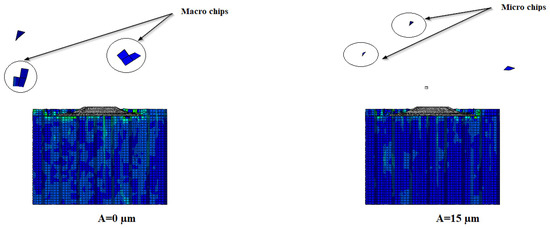 This section proposes a series of numerical simulations aimed at analyzing the effect of machining techniques on the size of the chips generated. To do this, two techniques were examined: conventional machining without vibrations (amplitude of 0 µm) and machining assisted by ultrasonic vibrations (amplitude of 15 µm). It is important to note that the numerical simulations are carried out under the same cutting parameters, namely a feed of 3000 mm/min and a spindle speed of 5000 rpm. The results of this study are presented in Figure 12.