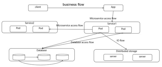 Due to the extremely large scale of operation and maintenance objects involved in the same business, the method of directly analyzing the fault location conclusion from the data source has become feasible. It is necessary to rely on the accurate abnormal perception of each operation and maintenance object to carry out analysis and location for the abnormal alarm of each operation and maintenance object. Therefore, this method relies on rich and complete alarm sources, including the system, network, application, equipment, and other professional monitoring alarms. The key technical point is to screen multiple source alarms and construct key features. Based on the complete and accurate dynamic operation and maintenance map data and various professional alarm data, this method studies the troubleshooting process triggered by an abnormal business flow, mainly including database access flow, read-write I/O flow, and microservice access flow. The business flow is shown in Figure 1. Through the analysis of the commonalities of various data flows (deployment relationship commonalities, connection commonalities (physical, logical), access flow commonalities), triggered by abnormal business flow, the possible root cause of the failure is located forwardly.