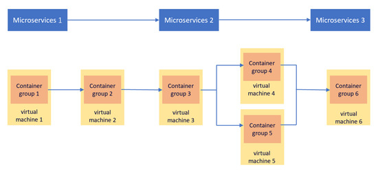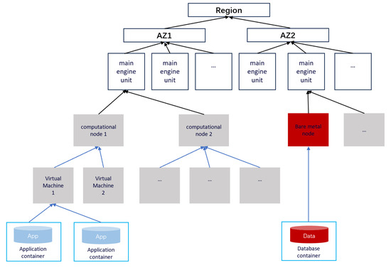 - Unify map data modeling [10,11,12,13]: The data model is divided into node and edge design. In terms of the node model, clarify the node types and attributes of each node type, including unique KEYs (this method uses IPs for alarm point attachment). Node types are obtained by refining and combing the operation and maintenance object directory of distributed information systems, covering applications, systems, networks, devices, etc., including but not limited to applications, application groups, middleware, PODs, virtual machines, physical machines, network devices, etc. In terms of the relationship model, it is mainly divided into two categories, one is the application access level topology, as shown in Figure 4. It mainly describes the call relationship between applications, groups, and services. The other is the vertical resource dependency vertical topology, as shown in Figure 5. It mainly describes the deployment and operation dependency relationship from large to small at the resource level.