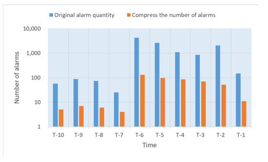 For this scenario, we utilized the test dataset pertaining to Fault Case 4, which focuses on the anomaly of an access switch. The experiment was conducted in two phases, with each phase utilizing the fault data to simulate fault recording and playback by inserting an empty real-time alert table for a duration of 15 min. In the first phase, the alert filtering logic was omitted from the model program. Subsequently, in the second phase, the alert filtering logic was incorporated into the model program, enabling a comparative analysis of the results.