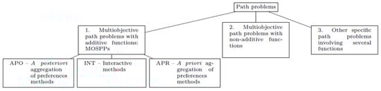 One of our main purposes in this work, developed in Section 2, is to provide insights into current research trends in the application of Operations Research techniques to solve multiobjective path problems and to outline possible future research directions. In particular, in the first part of this paper, we refer to articles that are focused on path problems and their resolution approaches. We considered works published in scientific journals, conference proceedings, and book chapters. We carried out a search in the following databases: Elsevier, Wiley, Springer, Scopus, IEEExplore, Research Gate, and Google Scholar; we used several keywords such as “multiobjective paths” or “multicriteria paths”. We also present a summary of the main features of the problems in tables, which can help the researchers in comparing the works and exploring new possible configurations.