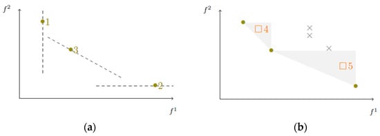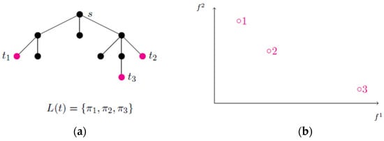 Two paths are designated as alternative (or equivalent solutions) if . In this paper, the set of all efficient paths is designated as a maximal complete set, and it may contain equivalent solutions. The minimal complete set is a subset of the maximal complete set that contains a single path from any set of equivalent solutions (corresponding to a unique nondominated point).