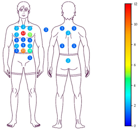 Body locations of sensor attachment and number of articles referring to each location. The number in each circle is the total number of articles that mention placing a sensor in that location. Referring to the body chart in the figure: Anterior view, from top to bottom, right to left of the body chart: right 2nd–3rd rib, manubrium, left 2nd–3rd rib, right 4th–5th rib, body of sternum, left 4th–5th rib, right 7th rib, xyphoid, left 7th rib, right 10th rib, bellow xyphoid, left 10th rib, bellow right ribs, abdominal region, bellow left ribs, and anterior superior iliac spine; Posterior view, from top to bottom, left to right of the body chart: left 2nd–3rd rib, thoracic intervertebrae (T4–T5), right 2nd–3rd rib, left 10th rib, right 10th rib, and sacrum. The only circle outside the body chart is referred to as the body region not related to respiratory movements or a stationary object, as are the sensors found in the anterior superior iliac spine and the sacrum. This figure has been designed using assets from www.freepik.com (accessed on 30 April 2024).