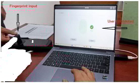 The experiment setup is made up of a biometric sensor, AccesSensor, used as a fingerprint input device for users of the industrial Metaverse system. A display device, a laptop of specification processor: Intel Core i7-1165G7 Processor, memory: 16 GB DDR4 2666 Mhz Memory, storage: 1TB PCIe NVMe M.2 SSD solid state drive internal storage, with connectivity to a wireless network and the server/database for validation, classification, matching and storage of FingerID, based on the deep learning classification of minutiae points for feature vector. The process for user validation includes the User Biometric entry phase and the User validation phase as displayed in Figure 3. The outcome of the timely validation process of User fingerID is Unmatched (Reject) or matched (Accept), for which user access to the Metaverse platform is declined or granted, respectively. In conducting extensive testing and evaluation of the algorithm using benchmark fingerprints from the database and real-world scenarios, and displaying the masked user interface, as shown in Figure 7.