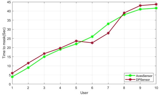 Furthermore, the outcome of the masking process as a privacy preservation measure by the AccesSensor, in contrast to the noise addition mechanism of the DPsensor is depicted in Figure 9. The validated finger ID of User 2 took our method, 9 s to be masked while the noise addition method of the DPSensor took 11.5 s to complete this privacy preservation process. Thus, this shows that our masking method is faster and more efficient in user validation than the compared method.