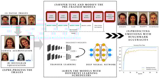 For comparison purposes, our experiment was structured in three distinct setups. Firstly, we maintained all layers of the base VGG19 and VGG16 models frozen, without applying any histogram equalization. Secondly, we fine-tuned the VGG19 and VGG16 architectures by unfreezing the last four layers of VGG16 and the last five layers of VGG19, while keeping the remaining layers frozen. This setup also did not include any histogram equalization. Lastly, we incorporated histogram equalization into the final experimental setup, along with fine-tuning the models as described in the second setup. For the KDEF dataset, our initial step involved optimizing the data for histogram equalization by converting the images to grayscale. Subsequently, to obtain the RGB format suitable for a pre-trained VGG network, we further transformed the grayscale images into RGB format. During this process, each pixel in the grayscale image replicated its intensity value across all three color channels. A general overview of our framework can be found in