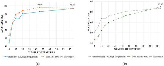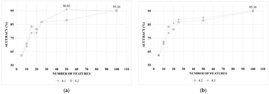Recognition accuracies obtained with 2-gram frequencies using feature selection procedure 4: (a) 4.1 and 4.2 variants of the feature selection procedure (see Formulas (12) and (13)); (b) 4.2 and 4.3 variants of the feature selection procedure (see Formulas (13) and (14)).
