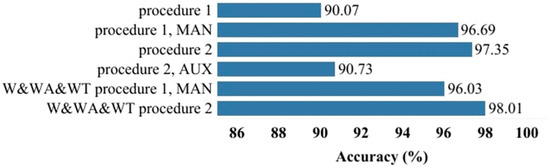It can be seen from Figure 4 that the frequencies of words selected using only procedure 2 turned out to be more effective in recognition than the frequencies of words selected using only procedure 1. Recognition accuracy increased when selecting words by manually removing some words—words used in everyday life, names of characters in literature works, and so on from among the words most used by authors, i.e., selected using feature selection procedure 1 (see groups “procedure 1” and “procedure 1, MAN” in Figure 4). Recognition accuracy decreased when the most common words in the training set, i.e., selected using feature selection procedure 2, were not selected from all words but only from words belonging to auxiliary parts of speech that do not have lexical meaning (see groups “procedure 2” and “procedure 2, AUX” in Figure 4). When the most frequently used words of authors are selected separately by the authors using feature selection procedure 1, in addition to the usage frequencies of words in a given text, the total usage frequency of words in each candidate author’s texts, and the total usage frequency in the training set are used in recognition, recognition effectiveness decreases (see groups “procedure 1, MAN” and “W&WA&WT procedure 1, MAN” in Figure 4). This may be due to the fact that the frequencies in the authors’ texts have already been taken into account when selecting words using procedure 1. In addition to the frequencies of the most frequently used words in the training set without taking into account author differences, total usage frequencies in candidate authors’ texts and the overall frequency in the training set are also used, and recognition accuracy increases (see “procedure 2” and “W&WA&WT, procedure 2” groups in Figure 4).