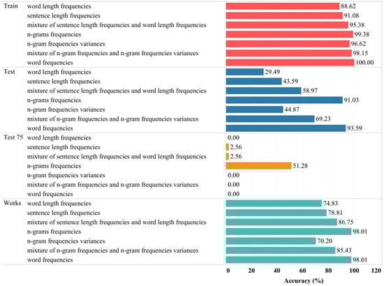 By recognition accuracy in a given set of texts whose authors are known, we mean the ratio of the number of texts whose author is correctly identified to the number of all texts in the set [33]. The sets used are as follows: Dataset-0, which consists of large and small literary works of authors; Dataset-1, which consists of small works and separate parts of each of the large works in Dataset-0; and training and test sets obtained from the division of Dataset-1. The recognition accuracies obtained for the training set and the test set, as well as for Dataset-0—a set of original large and small literary works, themselves used with different methods of machine learning with different feature groups used—are given in the tables and images below. Sometimes, recognition accuracies with a certain confidence percentage on the test set, for example, 50%, 75%, 95%, and 99%, are also given, where the confidence percentage means that texts whose author is known with a confidence that is below the percentage are accepted as not correctly recognized. Note that in the figures and tables provided in this study, we will denote Dataset-0 with the word “Works” for simplicity and immediate understanding.