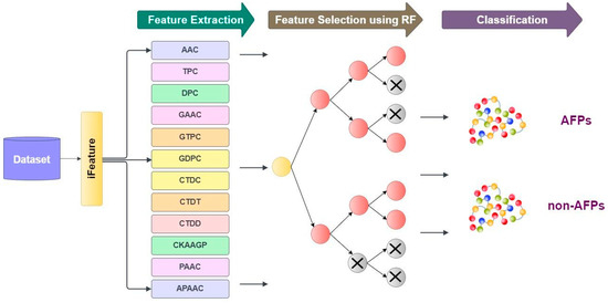 The overall architecture of AFP-MVFL. The AFPs prediction pipeline consists of three modules: (i) feature extraction module using iFeature; (ii) feature selection using random forest; (iii) classification module for the prediction task.