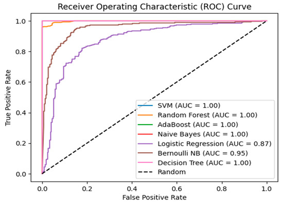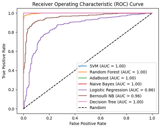 SVM is one of the most extensively used machine learning techniques in this field. It has been shown to outperform other classifiers for similar tasks [26,27,28]. SVM aims to identify the biggest marginal hyperplane across classes to decrease prediction errors and improve classification task generality. In the case of linearly separable data, it generates a hyperplane with a maximum margin to distinguish two distinct classes. The SVM technique employs many kernel functions, such as linear, nonlinear, polynomial, radial basis function (RBF), and sigmoid [29]. In this study, we have used the linear kernel for the SVM and “C = 1” as a regularization parameter to influence the trade-off between having a smooth decision boundary and classifying the training points correctly.