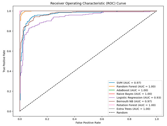 To test the efficiency of our extracted features and identify the best classifier to build our model, we investigated eight different classifiers, most of which have been effectively used for similar studies [25]. These eight classifiers are support vector machine (SVM), logistic regression (LR), decision tree (DT), rotation forest (RT), stochastic gradient descent (SGD), AdaBoost, naive Bayes (NB), and random forest (RF).