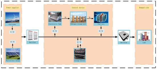 This section describes a hybrid AC/DC microgrid system that utilizes renewable energy sources such as wind and PV as the primary power source. The AC/DC power generated by the system is rectified to produce a stable DC voltage, which is then transmitted to the DC bus as the power source. The system consists of three main parts: the power generation system, which includes the AC/DC power generation equipment and rectifier; the control and regulation system, which includes energy storage devices such as batteries, electrolyzers, fuel cells, and hydrogen storage tanks, as well as an MPC system; and the load demand side, which consists of the power demand of various loads. Together, these three parts form the hybrid AC/DC microgrid system. The AC/DC hybrid power generation equipment on the power supply side provides stable electrical energy , while the control system is responsible for regulating energy storage or supply in cases of energy surplus or shortage. The loads on the demand side consume electrical energy . The control structure principle is illustrated in Figure 1.