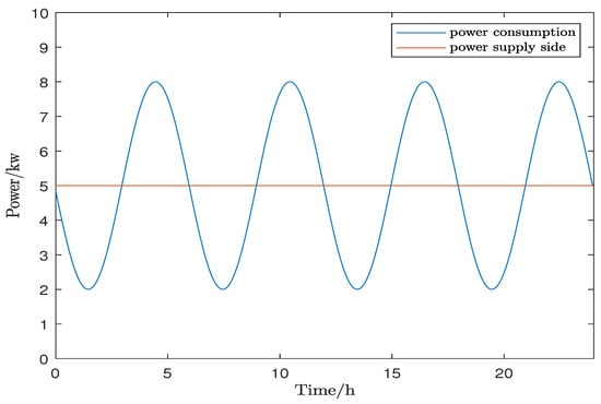In the current simulation experiment, as shown in Figure 2, the power supply side can continuously provide stable energy within 24 h, while the power consumption by the load side during this period is as follows:
