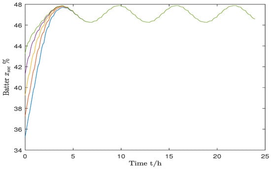 Based on the simulation results graph depicting the variation in battery capacity shown in Figure 3, it can be observed that within 24 h, the battery capacity remains within the constraints (i.e., ).