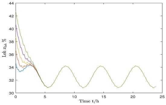 The simulation results graph in Figure 4 illustrates the variation in the capacity of the hydrogen storage tank in an AC/DC hybrid microgrid based on ST-MPC. According to the simulation experiment results, it is evident that within 24 h, the hydrogen storage tank capacity remains within the prescribed constraints (i.e., ), and there are no instances of exceeding the constraint boundaries.