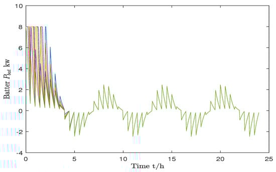 The situation described in Figure 5 is a simulation result graph illustrating the state changes in battery charging and discharging. From this graph, it can be observed that within 24 h, the battery charging and discharging behavior, after a brief adjustment by ST-MPC, effectively tracks the variations in power supply and demand (as shown in Figure 2).