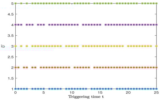 By solving the optimization problem stated, we obtain the optimal predictive control sequence, denoted as . According to the self-triggered condition given by Equation (14), we select the relevant useful control input as follows: