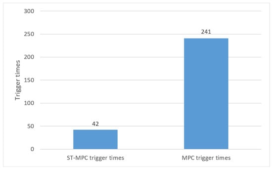 Figure 8 is a comparison histogram of the number of ST-MPC triggers in this article and the number of MPC triggers in [22]. It can be seen that the number of ST-MPC triggers used in this article is significantly smaller than the number of MPC triggers, which reduces the number of triggers by . At the same time, the control and scheduling of the energy storage module are realized, and it can be concluded that the ST-MPC used in this article can effectively save control resources and communication resources.