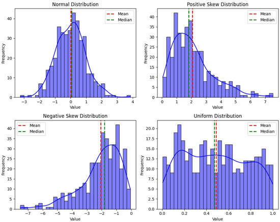 Figure 1 illustrates four distinct probability distributions: a normal distribution characterized by a symmetrical bell curve; a negatively skewed distribution, where the mean is typically less than the median and the tail extends toward lower values; a positively skewed distribution, where the mean is typically greater than the median and the tail extends toward higher values; and a uniform distribution, featuring constant probability density across the range of values. The same principle applies to other distributions, such as exponential, bimodal, and multimodal distributions, where the relationship between the mean and median may vary.