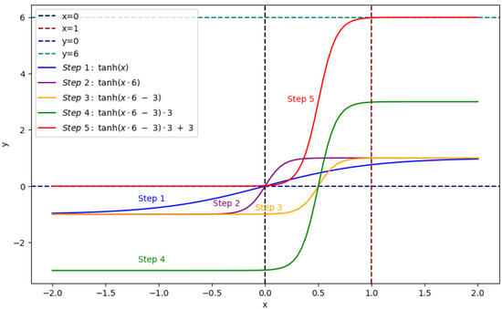 - : Scaling the input by a factor of 6 horizontally stretches the sigmoid curve, resulting in a more elongated shape compared to the original tanh function.
