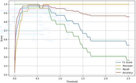 Our findings indicate promising results with the algorithm achieving near-perfect precision across various threshold values as depicted in Figure 6. This high precision underscores the algorithm’s efficacy in accurately identifying true anomalies, rendering it suitable for scenarios where precision is paramount. However, we observed a sensitivity in recall and accuracy to threshold adjustments, emphasizing the inherent trade-off between precision and other metrics. This flexibility in prioritizing precision underscores the adaptability of the algorithm to accommodate different application requirements and preferences.