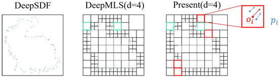 In conventional 3D reconstruction methods, autoencoders were widely employed to extract global or local shape features, which were subsequently used to generate the 3D surface. For instance, DeepSDF generates an implicit encoding for each shape, representing its global features. However, the shape surfaces generated by this method often lack detail and struggle to effectively capture intricate information. Consequently, methods have been proposed to transform the target shape from global to local, utilizing local features to express shape details. Among the partitioning methods, the octree data structure has proven to be the most effective, as exemplified by the O-CNN. O-CNN first normalized the target shape to a unit voxel and then performed octree division. Each voxel after division is termed an “octant”. This octree partition operation is repeated until the specified depth is reached or the number of point clouds within the octant is less than the specified threshold. DeepMLS is a 3D reconstruction based on O-CNN; adaptive O-CNN proposed an adaptive octree partitioning method. Unlike O-CNN, this paper added a partitioning criterion based on O-CNN; that is, whether the point cloud within the octree can be fitted by a plane. When the plane can fit the point cloud within the octant, it indicates that the local area is sufficiently flat and does not need to be further partitioned. However, according to the planar fitting results of adaptive O-CNN, the generated shape surface is not smooth enough.