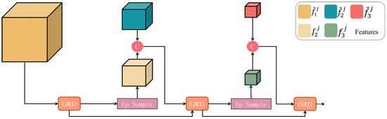 The GRU module is shown in Figure 3. After data partitioning through adaptive octree and processing with convolutional neural networks, feature representations of different depths were obtained, such as , , . corresponds to the relatively shallow octant, where represents all octants at the same octree depth. is a sub octant of , and represents the deeper octant. is input into the GRU module and then up-sampled to obtain the deformed feature . The purpose of up-sampling is to maintain the same number of channels for and , facilitating concatenation and transfer to the next GRU. is then obtained through GRU and up-sampling, matching the number of channels of . They are then concatenated and passed to the next GRU. This process continues sequentially to achieve the transmission and fusion of features across different octant depths. In Figure 3, information flows from left to right (from shallow octants to deep octants) within the GRU module. This ensures that feature information and contextual information between different scales are fully exchanged and integrated, ultimately enhancing the learning and representation capabilities of the entire network and further optimizing the 3D shape-reconstruction process.