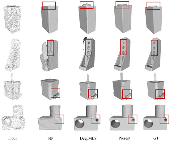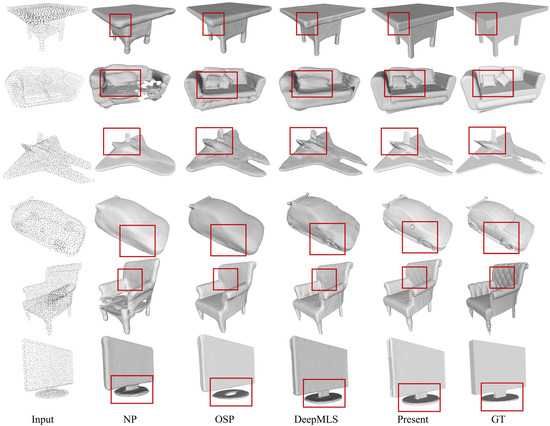 Several deep-learning-based surface-generation methods (DeepSDF, MeshP [39], LIG [40], IMNET [41], NP, DeepMLS) were quantitatively compared on the ShapeNet dataset. (↑ and ↓ indicate that either larger data values are better or smaller data values are better, respectively). Table 1 shows the comparison results of the above methods on NC evaluation indexes. The comparative experimental results show that the proposed method achieves a high score in the NC evaluation index, which means that the surface generated by the proposed method is closer to the ground truth surface in terms of accuracy and fidelity. Compared with other methods, this method can better restore the details and overall characteristics of the target shape to provide more accurate and reliable surface-generation results.