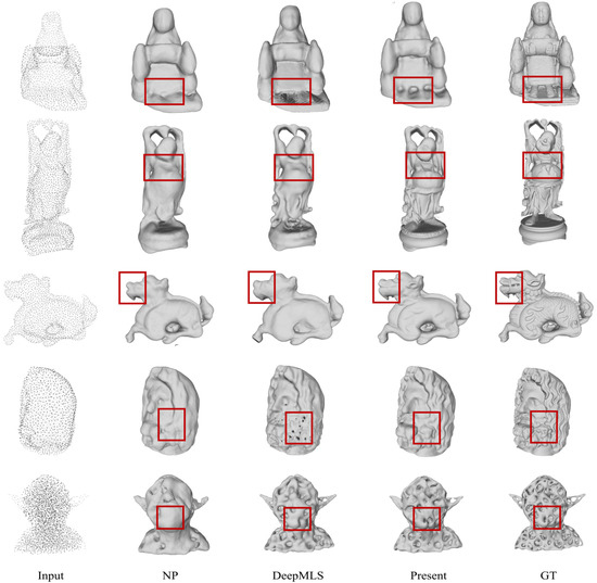 Compared with the ABC dataset, the Famous dataset is more complex in shape, contains more shape details, and is usually presented as an irregular surface, making it more challenging for 3D surface generation. In the paper, a visual comparison is performed on the Famous dataset, and the results are shown in Figure 6. By comparing the NP and DeepMLS methods, it can be observed that the proposed method successfully avoids the adhesion of the shape surface (such as the leg area of the first-row shape), can generate fine surface details (such as the hem of the character in the second row, the face of the shape of the third row), and avoids the generation of “holes” (such as the beard in the shape of the fourth row), which further verifies the ability of the proposed method to deal with complex shapes and details, and demonstrates its robustness and superiority in challenging scenarios.