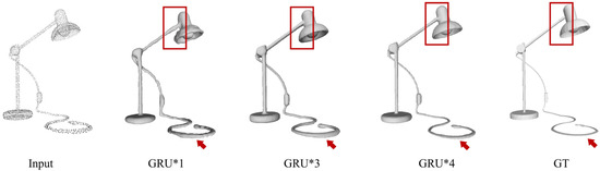 To verify the effectiveness of the GRU module in the paper, an ablation experiment was performed, and the visualization results are presented in Figure 9. In the experiment, “GRU*1” indicates that only one GRU module is connected after the shallowest octant (third layer). From the results of observation, when there is only one GRU module, it is difficult to keep the generated surface smooth and continuous. In contrast, “GRU*3” refers to the insertion of three GRU modules after the octant of the third-to-fifth layers. By observing the experimental results, compared with “GRU*1”, the surface quality generated by “GRU*3” is significantly improved, and although the GRU is not connected to the deepest octant node, the generated surface still maintains good continuity and avoids sharp edges. In addition, “GRU*4” means that four GRU modules are connected after the octant of the third to sixth layers. According to the results, “GRU*4” is more accurate than “GRU*3” in the expression of wires, and at the same time, it can better show the sharp features of the edge of the lampshade, making it closer to the ground truth surface. This shows that adding the GRU module can effectively extract the relationship between local and global features, which helps to improve the quality of generated surfaces, especially when dealing with complex structures and details.
