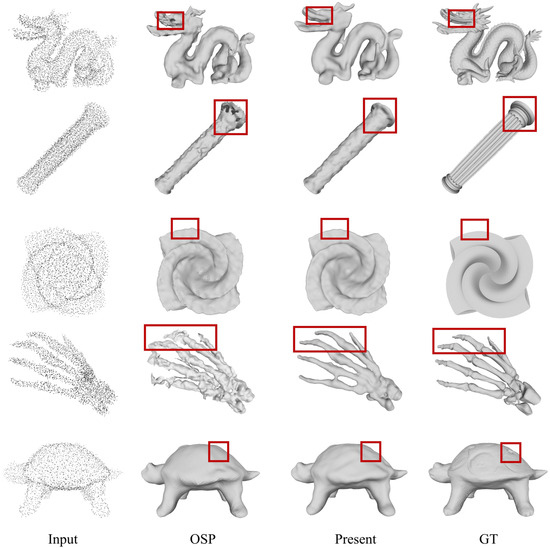 We train on a clean point cloud while adding a value of 0.01 () Gaussian noise to the input point cloud during testing, which is to simulate the noise of the data in the actual scene, and then verify the surface-generation ability of the network model for the noisy point cloud. By inputting the noise point clouds into the network and comparing the surface-generation capabilities of the proposed method with the advanced OSP method, the adaptability of the proposed method to the noisy point clouds can be more clearly evaluated, as shown in Figure 10. To ensure the comparability of the experiments on OSP and the method in the paper, a control experiment on OSP was conducted in the paper, and the experimental settings of the two methods were optimally adjusted according to the experimental needs. For example, for the OSP method, set the number of input point clouds to 2 k and perform 30 k iterations. For the proposed method, 3 k input point clouds were used, and GPU*4 (such as Figure 9) was used for experiments.